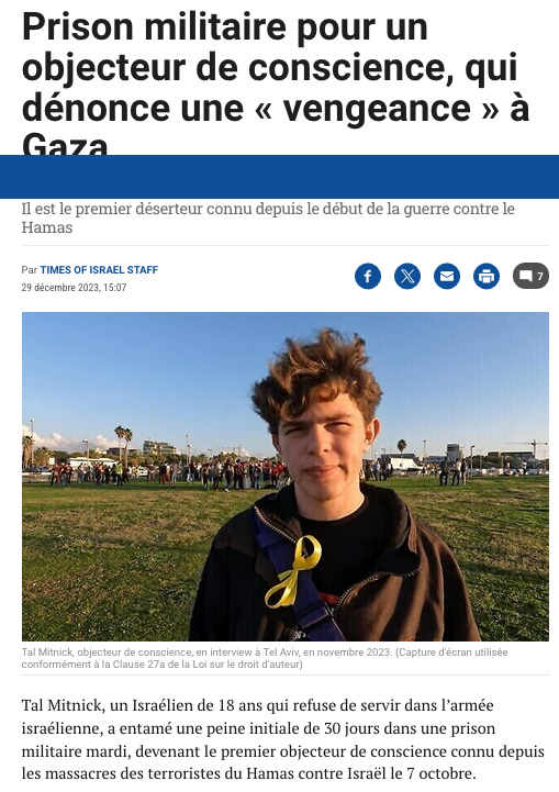 Et à un certain degré, même les soldats, ne sont que des pions dans ces conflits. Oui, ils ont la responsabilité aussi de leur choix d'être dans cette situation contrairement aux civiles qui ne font pas le choix d'être là. Mais pour plusieurs soldats, peu d'autres options se présentaient à eux dans leur vie. D'autres croyaient aider, peut-être en allant secourir dans des désastres naturels surtout... Les jeunes Israéliens eux ont un service militaire obligatoire. ET, on a toujours le choix, mais il faut le savoir.. Quelques jeunes de ce pays optent d'ailleurs pour être des objecteurs de conscience; refuser de servir comme soldats, certains le font en faisant un “service” social, d'autres désobéissent et en vivent les conséquences. Plusieurs Palestiniens aussi refusent de servir le conflit armé...la nonviolence est vivante des deux côtés, mais va-t-on en entendre parler par les médias conventionnels ? Je vous laisse répondre. C'est pourquoi des médias comme Substack sur lequel je publie existent.