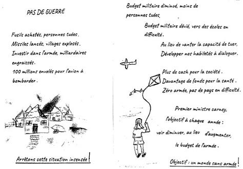 Rapidement - 4 groupes de réflexions se sont crées sur différents thèmes importants pour les personnes présentes. Ces groupes avaient des personnes de tous âges…les plus jeunes ayant 5 ans ! Moi par exemple, je méditais avec Maël, 12 ans …sur la guerre et ses conséquences. Dans chaque groupe, les partages qui sont nés et évolués nous ont soudés pour toujours dans ces réflexions, textes, photos, dessins et ce moment de création.
