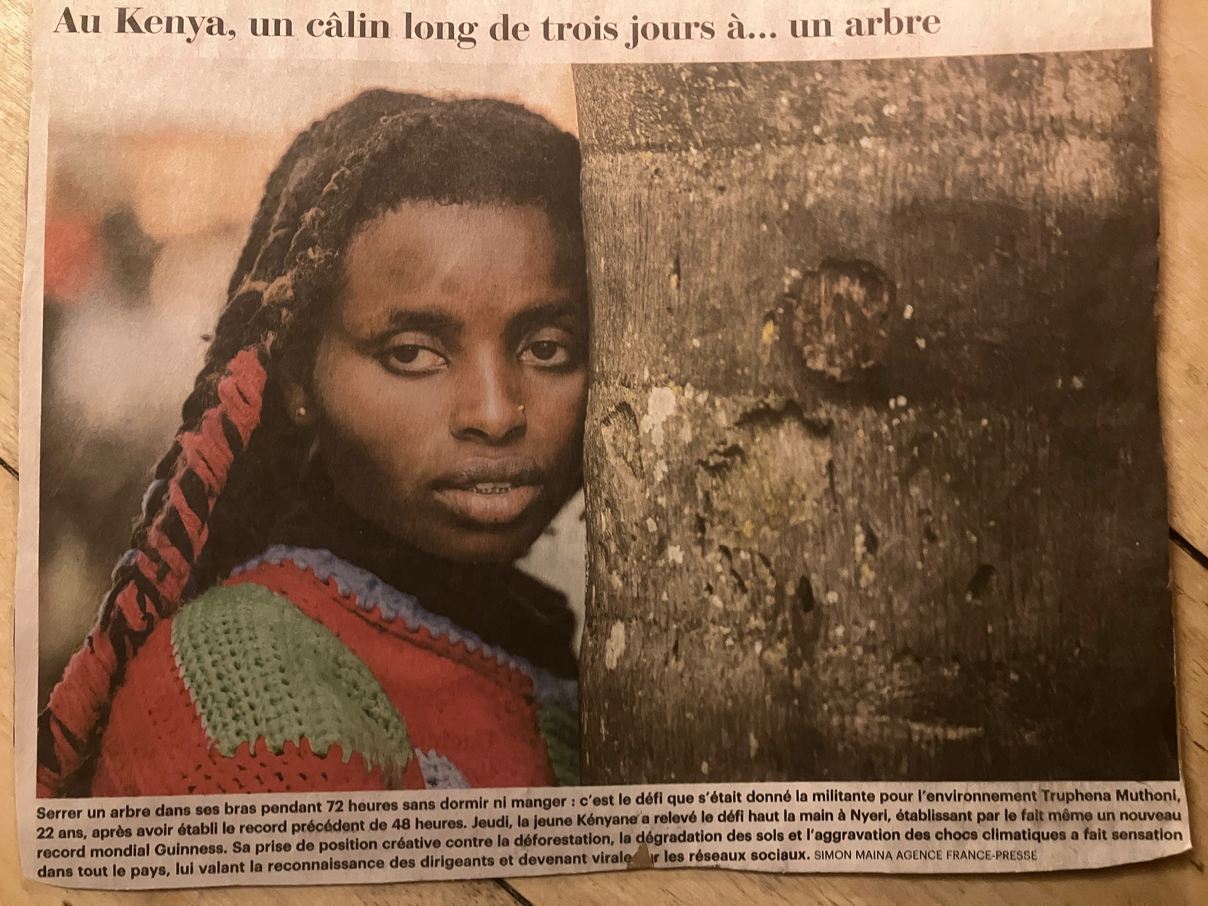 Je suis tombé sur cette image dans le journal Le Devoir cette semaine. J’au vu une relation d’amitié et la fatigue sur le visage de cette jeune de 22 ans. Elle venait de passer 72 heures debout, étreignant cet arbre pour le protéger, pour LES protéger. Pour sensibiliser la population de son pays et du monde à la beauté et le droit de la biodiversité. Son action était simple, mais demandait une volonté de fer, demandait un sacrifice de son bien-être, de son confort, peut-être même de sa sécurité. Cela est la base d’une action de résistance nonviolente; un geste créatif qui démontre notre AMOUR radical pour la Vie. Son geste était positif, imagé, plein d’amour et de symbolisme. C’était une action bien réfléchie; car simple, efficace, rassembleuse et puissante. Malheureuseument, parfois des activistes font des actions bien intentionnées mais qui se mettent des milliers de citoyens à dos, de la cause défendue. Le but d’une action est toujours de se faire des alliés contre les pouvoirs destructeurs. Cette jeune femme l’a comprise. On ne viendra jamais à bout de la créativité - ingrédient de base de la nonviolence…et le respect et la révérence qu’elle produit.
